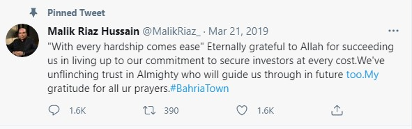 Source: Malik Riaz Tweet on Mar 21, 2019