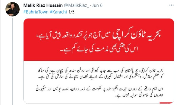Malik Raiz on the 6th June tweet made a statement on the carelessness and silence of the Government, Security forces, and Sindh Police.