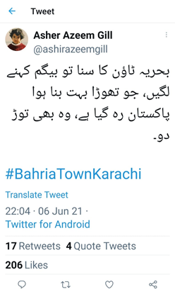 The Bahria Town Management has also pressed charges against those involved in violence and property damage on 6th June 2021, at Gadap City Police Station, District Malir at 7 pm. This Fir was written under the authority of SHO Inspector Ashraf Jaan. The Report number is 22.